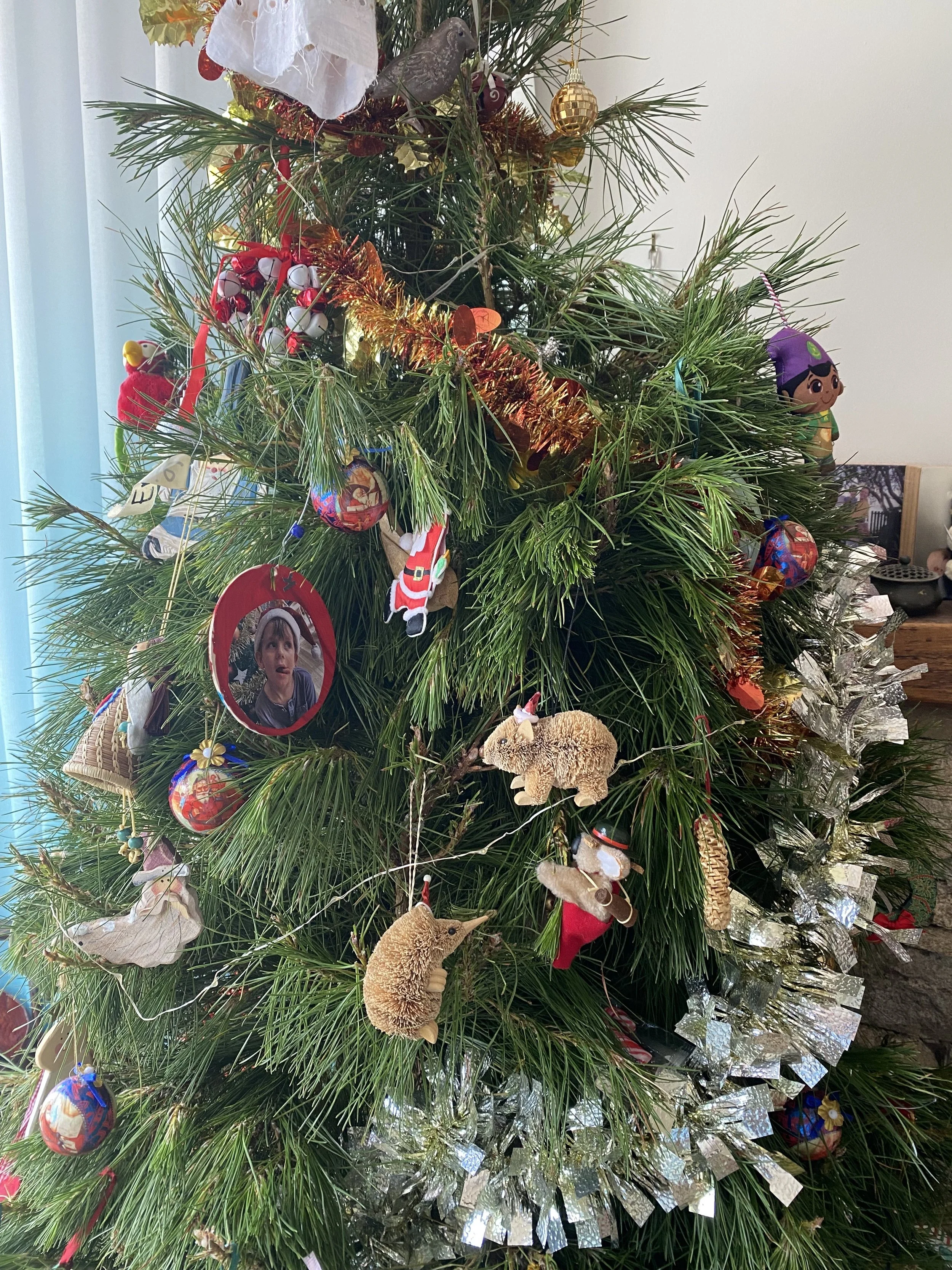 The Christmas Tree at our place includes local Australian flora and fauna, including a koala swagman!